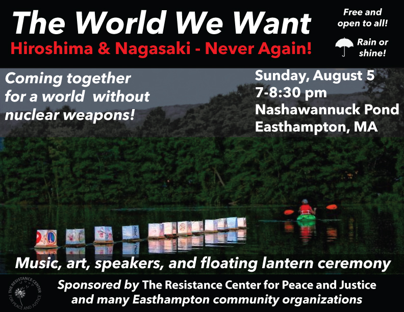 Music, art, speakers, and floating lantern ceremony. An event for all ages. Coming together for a world without Nuclear Weapons! At Nashawannuck Pond in the heart of downtown Easthampton. 7-8:30. Performances, ice cream, event salutes, and the beautiful floating lantern ceremony.